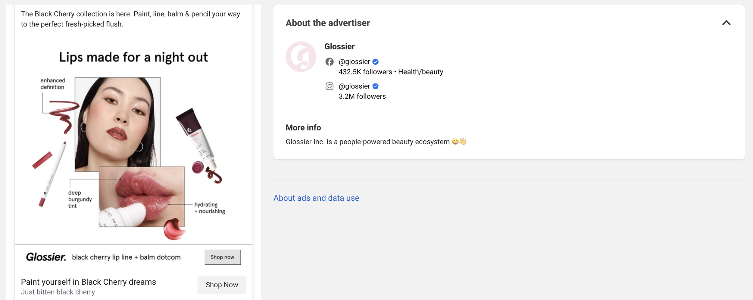 Meta Ad Library (Summary of Glossier’s Most Recent Ad)