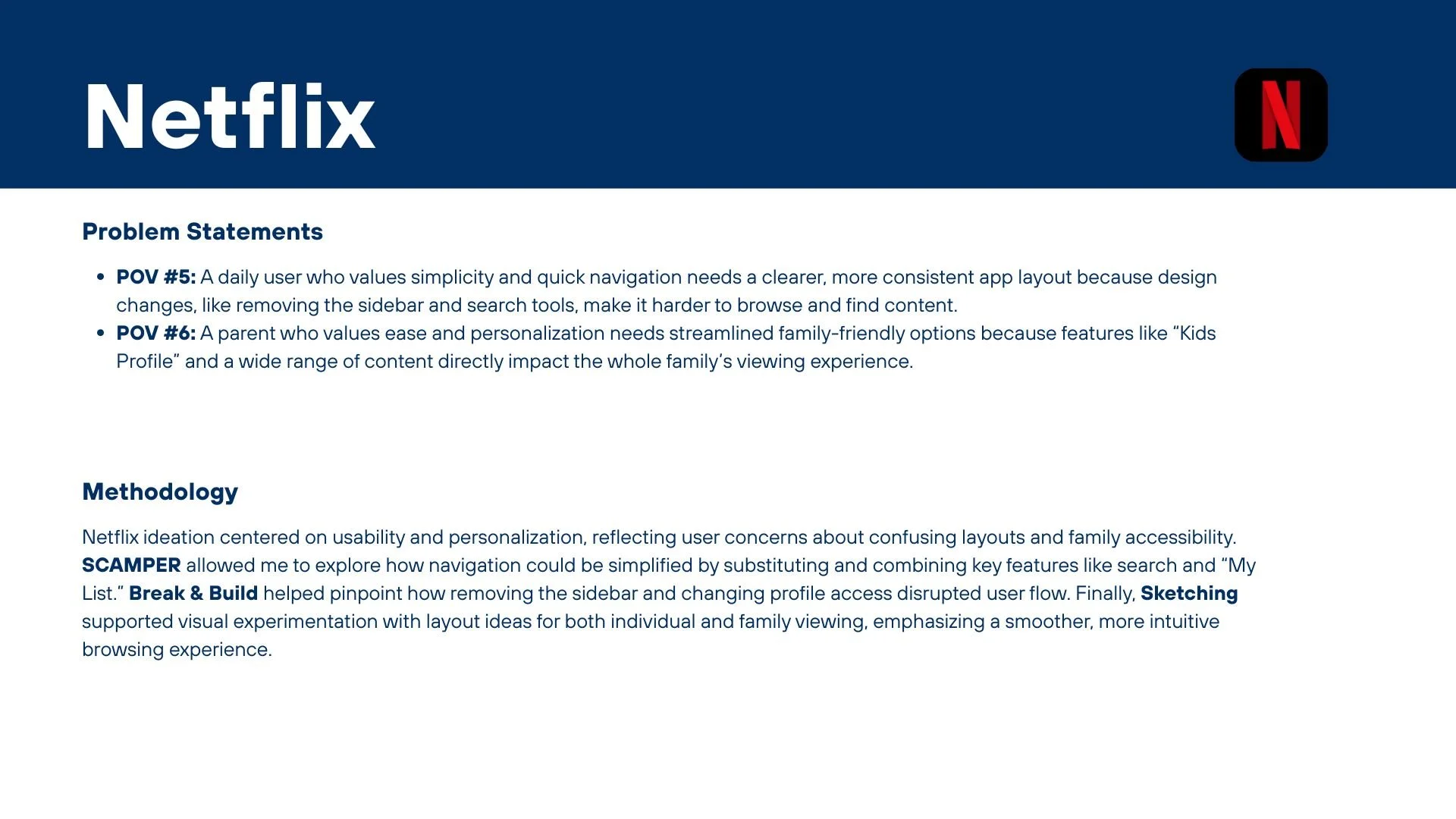 Netflix’s challenges focused on navigation and personalization, with users frustrated by layout changes and limited family controls. With SCAMPER, I used its action prompts to question how existing tools—search bar, filters, and profiles—could be simplified. Break & Build clarified which recent design updates disrupted the browsing experience, allowing me to rebuild the app around ease and clarity. Lastly, Sketching turned those concepts into visual prototypes, illustrating cleaner navigation and improved profile options. These methods worked together to merge creative exploration with practical usability, reflecting Netflix’s dual role as both a design-driven and family-oriented platform.