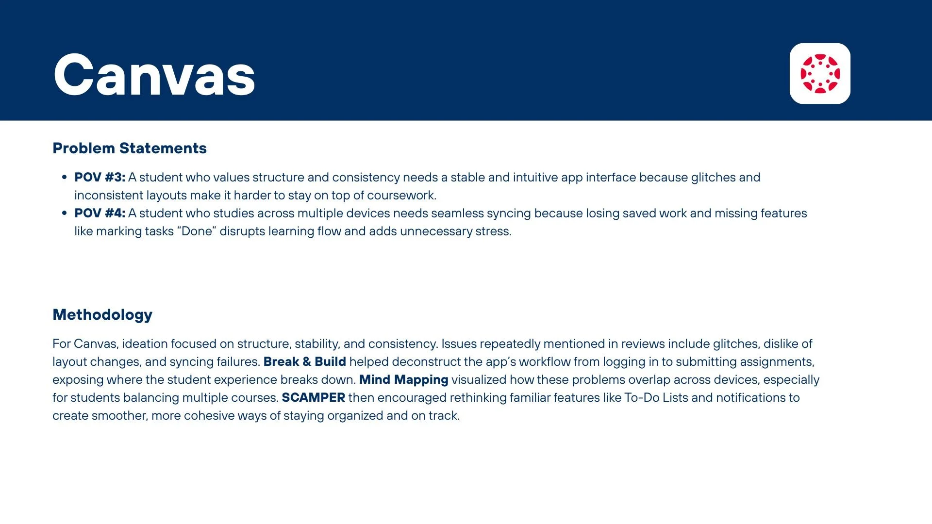 For Canvas, ideation centered on structure and consistency, issues that dominate user reviews about glitches, layout confusion, and syncing failures. Break & Build helped me deconstruct the student struggles, identifying where inconsistent designs interrupt learning flow. Mind Mapping visualized the relationships between layout, notifications, and device syncing, making it easier to see how one small issue impacts the entire user experience. To expand on these insights, I used SCAMPER to try and improve functionality through substitution, combination, modification, and adaptation. As discussed in Essential Ideation Techniques, this kind of lateral thinking pushes ideas beyond surface-level fixes to more transformative solutions.