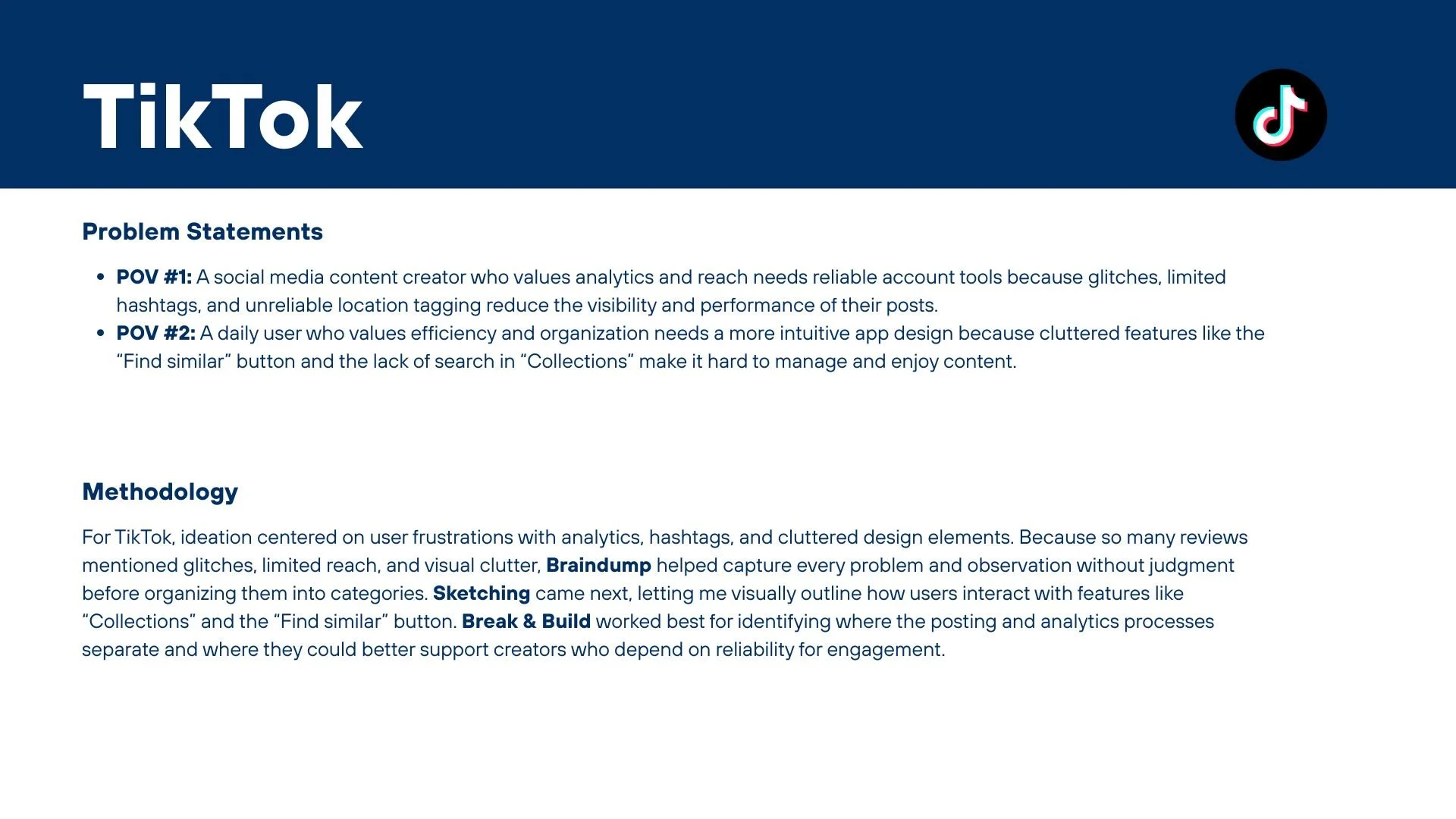 For TikTok, user feedback revolved around analytics, hashtags, and cluttered design elements. I began with a Braindump to capture every frustration without judgment. Writing freely helped me see patterns in how creators struggle with limited reach and unreliable tagging. Sketching followed, visualizing a unified place for content creator statistics, and adding features to the Collections. Finally, Break & Build allowed me to separate and reconstruct the posting and analytics workflow, revealing where features could better support creators seeking reliability and engagement. These techniques fit TikTok’s dynamic environment, balancing rapid idea generation and structured refinement.